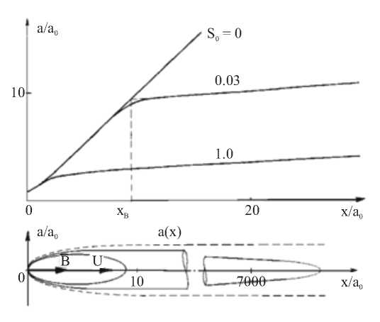 На рис. 2 приведены результаты расчета формы струи в зависимости от величины параметра Ампера. На рисунке внизу показана в безразмерном виде конфигурация плазменной струи, истекающей вдоль магнитного поля. Масштабом линейных размеров служит начальный поперечный размер струи . На рис. 2 зависимость — это изменение поперечного размера струи, замкнутые кривые — это изоконцентрали .