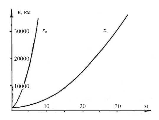 Геометрический предел влияния геомагнитного поля на разлет плазмы в зависимости от высоты орбиты представлен на рис. 3. Графики построены для струи холловского источника плазмы мощностью 1.35 кВт. Показана зависимость продольного размера от высоты орбиты (или, другими словами, от величины внешнего магнитного поля) и поперечного размера струи .