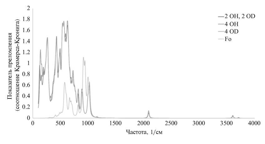 Вычисленный показатель преломления, соответствующий используемой 3D атомистической структуре форстерита с абсорбированными изотопологами воды ([-OH]–1 и [-OD]-1), показан на рис. 10.