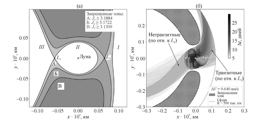 Для построения транзитных орбит использован геометрический критерий, предложенный ранее в работе [18] и основанный на использовании характерных особенностей структуры пространства векторов состояния круговой ограниченной задачи трех тел. Область возможных положений, определяемую соотношением (4), можно разделить на три подобласти, соответствующие трем слагаемым правой части уравнения (2), как показано на рис. 1а. Первое слагаемое отвечает внешней подобласти, второе — подобласти преимущественного влияния Луны и третье — подобласти преимущественного влияния Земли. При больших значениях эти подобласти не связаны между собой. При JC ≤ 3.1884 вторая и третья подобласти объединяются посредством перешейка в окрестности точки L1. При JC ≤ 3.1722 первая и вторая подобласти объединяются посредством перешейка в окрестности точки L2. Движение КА, начинающееся около Луны, будет транзитным по отношению к L2, если после попадания в ее окрестность он покинет вторую подобласть и окажется в первой. В качестве формального критерия этого перехода выбрано пересечение сферы с центром в Земле и радиусом 500 тыс. км, что проиллюстрировано на рис. 1б.