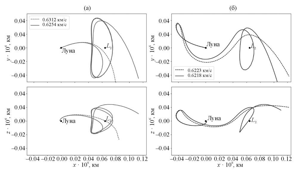 Рис. 5. Варианты перелета на ИСЛ через лунную точку L2 при совершении тормозного импульса у Луны 19.V.2030, 12:29:44 UT, показанные во вращающихся СК, соответствующих разным системам массивных тел: (а) Солнце – Земля; (б) Земля – Луна.