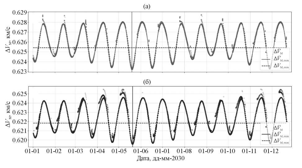 При рассмотрении траектории вне рамок ограниченной задачи трех тел возникают возмущения, связанные с эллиптичностью орбиты Луны, влиянием Солнца и планет Солнечной системы, поэтому значение изменяется в зависимости от времени совершения импульса. На рис. 4 представлены зависимости от даты в пределах 2030 г. (непрерывная линия) в сравнении со значением, полученным в круговой ограниченной задаче трех тел (VM,min — пунктирная линия) для двух вариантов перелета, рассмотренных выше. За счет эксцентриситета и эволюции Лунной орбиты, а также влияния Солнца, величина переходного импульса меняется в пределах 3…5 м/с в течение каждого лунного месяца.