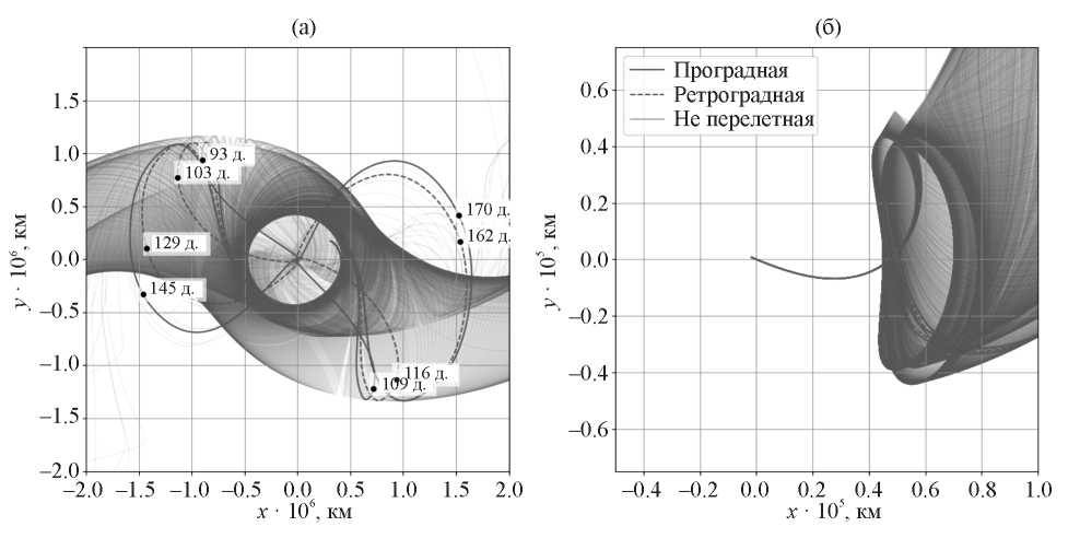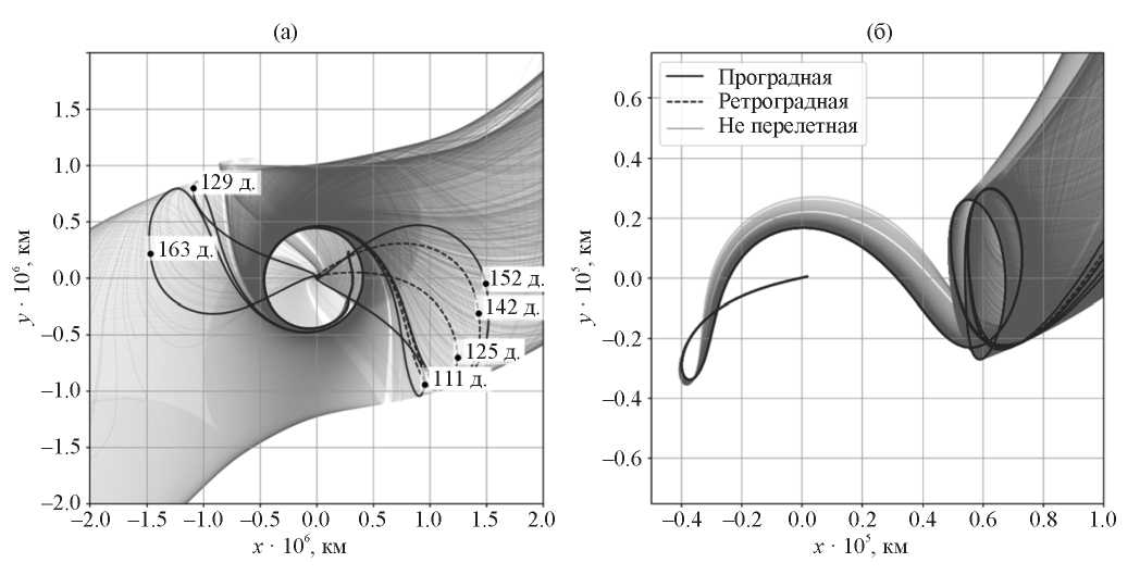 На рис. 5 представлены орбиты перелета, соответствующие дате выполнения тормозного импульса у Луны, отвечающей минимуму V˜M (19.V.2030, 12:29:44 UT) среди вариантов прямого перелета L2 – ИСЛ. На рис. 3а эта дата отмечена вертикальной линией. На рис. 5б траектории представлены во вращающейся СК, соответствующей системе массивных тел Земля – Луна. Варьирование V˜M в пределах 1 м/с порождает пучок траекторий, отличающихся временем, на которое КА задерживается в окрестности лунной точки L2. На рис. 5а эти же траектории представлены во вращающейся СК, соответствующей системе Солнце – Земля; можно видеть, что некоторые из них, сделав виток вокруг одной из точек либрации этой системы, проходят на близком расстоянии от Земли. Траектории, перигей которых находится на расстоянии 6545 км от центра Земли, показаны жирными непрерывными и пунктирными линиями. Пунктир означает, что траектория перелета соответствует ретроградной околоземной орбите. Проградным орбитам соответствуют траектории перелета, показанные непрерывной линией. Можно видеть, что низкоэнергетический перелет на орбиту ИСЛ возможен через одну из коллинеарных точек либрации (L1 или L2) системы Солнце – Земля. При этом в зависимости от времени нахождения в окрестностях этих точек, перелет может занимать разное время. Длительность представленных на рис. 5а вариантов перелета указана рядом с соответствующими траекториями и составляет от 92 до 169 дней.