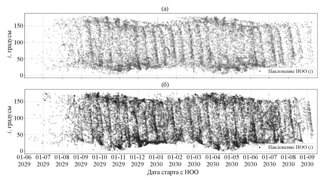 Рис. 7. Наклонение орбиты ИСЗ, с которой начинается перелет, в зависимости от даты старта при использовании различных маршрутов перелета: (а) маршрут без облета точки L1 системы Земля – Луна; (б) маршрут с облетом точки L1 системы Земля – Луна.