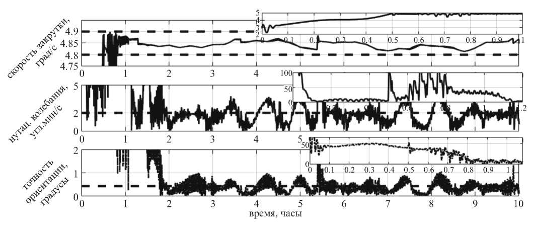 На рис. 2 на врезках выделен начальный переходный процесс. Видно, как на начальном этапе движения происходит одновременная раскрутка КА и гашение нутационных колебаний. Скорость вращения при этом должна поддерживаться в диапазоне 4.8…4.9 град/с. Примерно через 0.15 ч нутационные колебания подавляются, после этого продолжается раскрутка КА с медленным дрейфом оси вращения в инерциальном пространстве (алгоритм переориентации не работает). После достижения требуемой скорости вращения (примерно через полчаса) включается алгоритм переориентации. В результате резко повышается уровень нутационных колебаний, который постепенно снижается, пока аппарат не выходит на установившийся режим движения примерно через час после начала движения.
