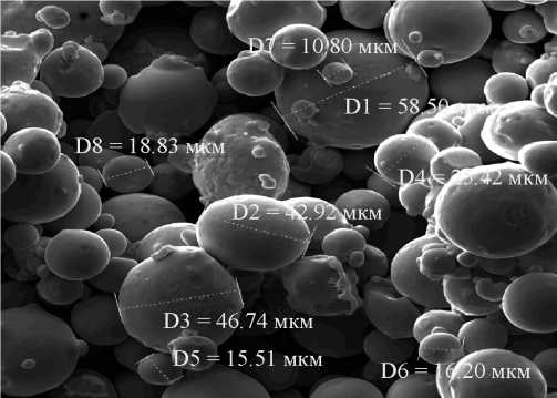 Рис. 3. Морфология поверхности частиц для порошка из нержавеющей стали марки 316L, размер фракций 10…50 мкм, форма близка к сферической [23].