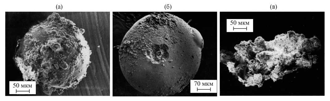 Рис. 4. Особые частицы реголита [22]: спекание частиц реголита на поверхности стеклянной сферической частицы, Луна-16 (а); ударный микрократер на поверхности стеклянной сферической частицы, Луна-16, Море Изобилия (б); дентритовидная частица (в).