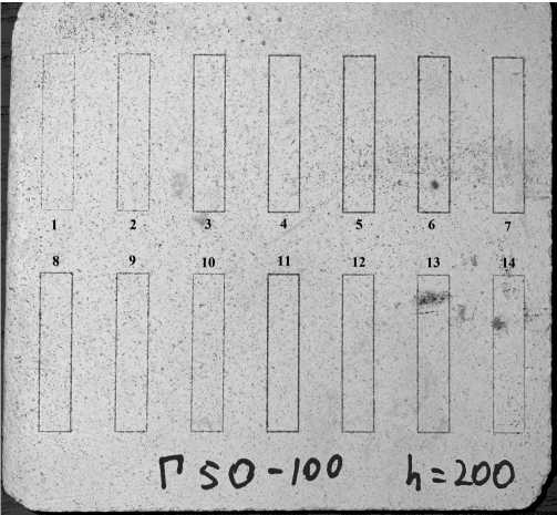 На первом этапе исследования условий сплавления одиночные треки сплавлялись в широком диапазоне изменения параметров: скорость сканирования лазерного луча V изменялась от 125 до 275 мм/с, мощность лазера P — от 20 до 100 Вт при толщине наносимого слоя h = 200 мкм. Таким образом, были выбраны 14 режимов для тестирования процесса сплавления. Каждому режиму соответствовала отдельная траектория движения луча лазера по подложке в форме прямоугольника (номера 1–14 на рис. 5).