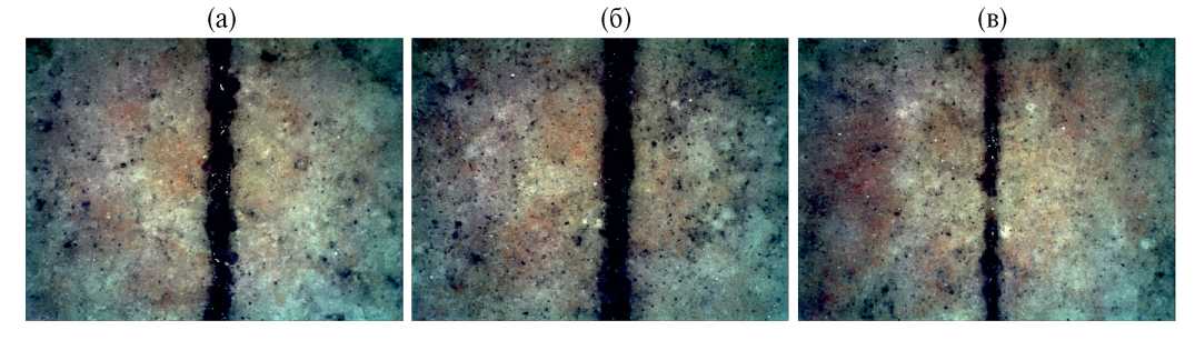 Рис. 6. Треки для порошковой композиции ГД 50-100 для разных режимов сплавления P, V: (а) — 100 Вт, 200 мм/с; (б) — 80 Вт, 175 мм/с; (в) — 50 Вт, 200 мм/с.