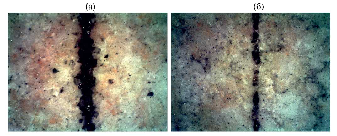 Рис. 7. Треки для порошковой композиции ЛДР 0-100 для разных режимов сплавления P, V: (а) — 80 Вт, 175 мм/с и (б) — 50 Вт, 125 мм/с.