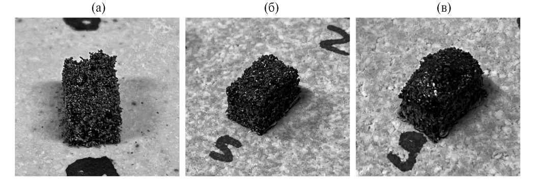 Рис. 10. Образцы, сплавленные при разных значениях объёмной плотности подводимой энергии: (а) — крайне рыхлый, плотность энергии менее 10 Дж/мм3; (б) — с удовлетворительной формой, плотность энергии 10…25 Дж/мм3; (в) — с крайне искаженной геометрией, плотность энергии больше 25 Дж/мм3.