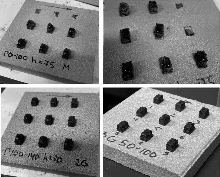Было получено 36 образцов для ГД 50-100 и 72 для ГД 100-140. Проведено 15 экспериментов по СЛС в различных режимах для изготовления тестовых образцов из габбро-диабаза, преобразованного в порошковые композиции с узкими диапазонами фракционности ГД 50-100 и ГД 100-140. Использовано 15 кг исходного материала. Суммарное время работы лазерной установки составило 15 ч.