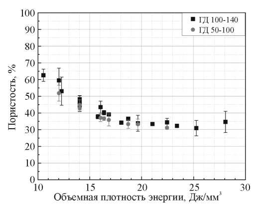 Рис. 13. Зависимость пористости образцов для композиций ГД 50-100 и ГД 100-140 от объемной плотности подводимой энергии E.