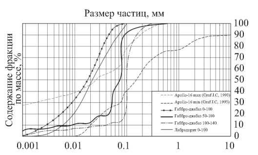 Рис. 14. Интегральные распределения частиц по размерам для порошковых композиций: ГД 0-100, ГД 50-100, ГД 100-140 и ЛДР 0-100 и область распределений частиц для всех образцов реголита с Apollo-16 (Apollo-16 max и Apollo-16 min).