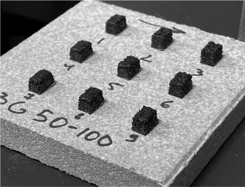 Для выполнения лабораторных исследований было изготовлено 36 тестовых образцов из ГД 50-100 и 72 тестовых образца из ГД 100-140 с характерными размерами (длина, ширина, высота): 7.5×5×6 мм3. Ниже приведены результаты их лабораторных испытаний.