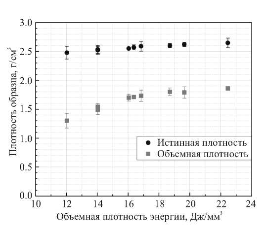 На рис. 2 и 3 приведена зависимость объемной и истинной плотности, а также отношение между ними для образцов, изготовленных из порошковой композиции ГД 50-100 в диапазоне изменения плотности энергии сплавления от 12 до 22.5 Дж/мм3. Для каждой точки было изготовлено по четыре образца, для которых полученные значения хорошо согласуются между собой — разброс составляет не более 12 % (в основном, 0…6 %). Представленные на рисунках погрешности соответствуют точности измерений и стандартному отклонению, полученным для разных образцов.