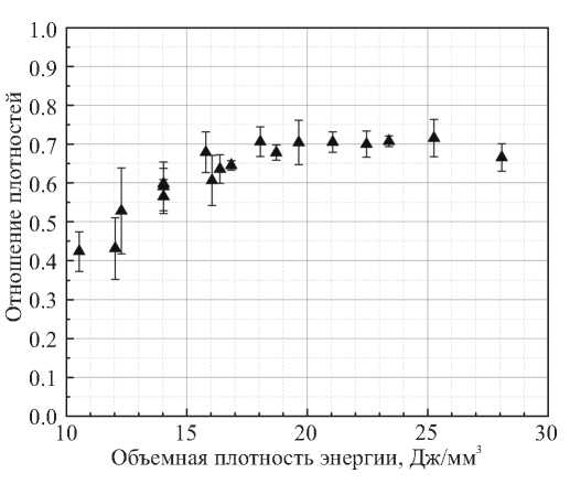 Очевидно, что отношение объемной и истинной плотности образцов испытывает рост при росте плотности энергии от 12 до 19 Дж/мм3 главным образом вследствие возрастания объемной плотности (рис. 2 и 3). В интервале значений плотности энергии выше 19 Дж/мм3 отношение плотностей остается постоянным на уровне около 0.7.