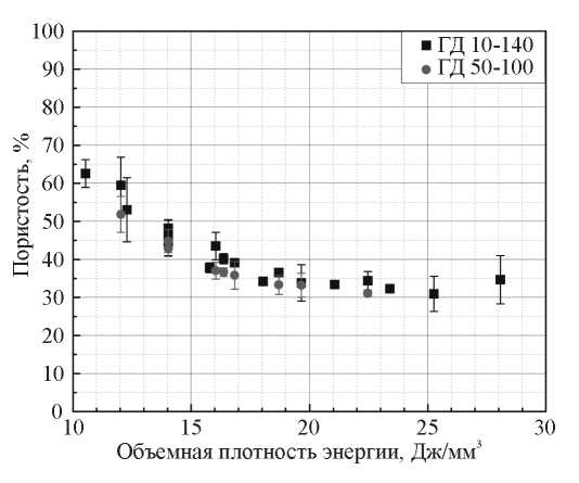 Рис. 6. Зависимость пористости тестовых образцов от плотности подводимой энергии для порошковых композиций ГД 50-100 и ГД 100-140.