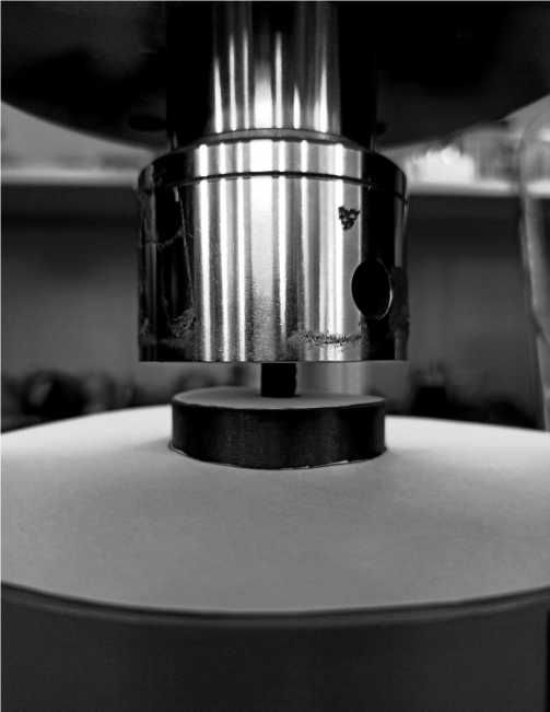 Исследования механической прочности проводились на основе стандарта ГОСТ Р 57606-2017 «Композиты керамические. Метод испытания на сжатие при нормальной температуре» на универсальной электромеханической испытательной машине фирмы «Инстрон» модель 1115 со сменным динамометром с предельной нагрузкой 5 кН. Пример установки образца в измерительном приборе представлен на рис. 7.
