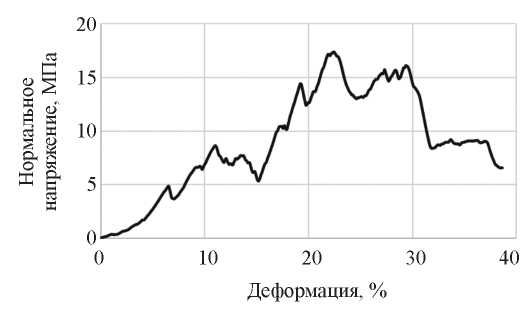 Рис. 9. Пример деформационной кривой: нормальное напряжение на сжатие образца в зависимости от деформации.