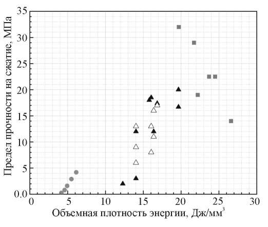 Рис. 10. Зависимость предела прочности на сжатие сплавленных образцов от объёмной плотности энергии: белый треугольник — ГД 50-100; чёрный треугольник — ГД 100-140; серый круг и серый квадрат — данные, приведенные в работах [17] и [18] соответственно.