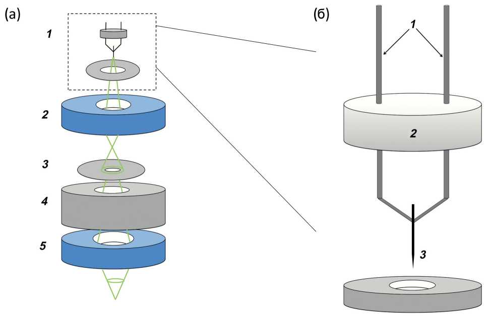 Рис. 4. Схема ионно-оптической колонны (а): 1 – ионная пушка, 2 – конденсорная линза, 3 – диафрагма, 4 – отклоняющая система, 5 – объективная линза. Схема ионной пушки (б): 1 – токовые электроды, 2 – изолятор, 3 – острие, 4 – экстрактор.