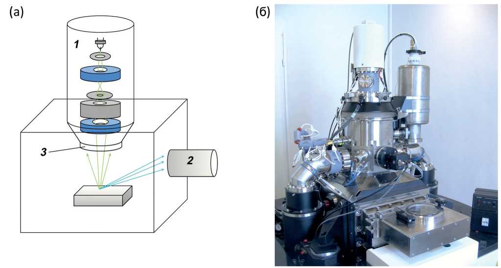 Рис. 5. Схема сканирующего ионного микроскопа (а): 1 – ионно-оптическая колонна, 2 – детектор вторичных электронов, 3 – детектор обратно рассеянных ионов. Внешний вид сканирующего гелиевого ионного микроскопа (б).