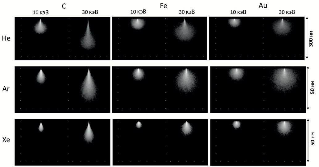 Рис. 6. Сечения объема взаимодействия ионов с веществом, рассчитанные методом Монте-Карло: горизонтальный ряд соответствует иону, указанному слева от ряда (He, Ar, Xe); вертикальный ряд из пар изображений соответствует материалу мишени (C, Fe, Au). В каждой паре левое изображение рассчитано для энергии ионов 10 кэВ, правое – 30 кэВ. Размер области расчета для ионов гелия – 300 нм, а для ионов аргона и ксенона – 50 нм.