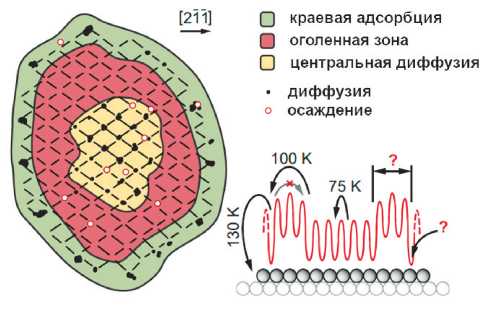 Попытка прямого наблюдения динамики роста адатомов на поверхности островков была впервые предпринята в экспериментах полевой ионной микроскопии Эрлихом и Гольцхаузером [15]. Эти эксперименты продемонстрировали, что движение адатомов на вершинах островков отличается от их движения по ровной поверхности. При диффузии иридия на поверхности Ir(111) и платины на поверхности Pt(111) была обнаружена “оголенная” зона, разделяющая центральную область и край кластера (рис. 3). Эта загадка впоследствии была разгадана с помощью уникальной методики расчетов на атомном уровне. Расчеты показали, что эффект пустых зон является следствием тонкого баланса между деформационными релаксациями в системе и уменьшением координационного числа на краях кластеров с образованием невыгодной зоны адсорбции, разделяющей центральную и краевую части островков [1, 16]. В результате отдельным атомам приходится преодолевать энергетический барьер, чтобы пересечь пустую зону и достичь края кластера.