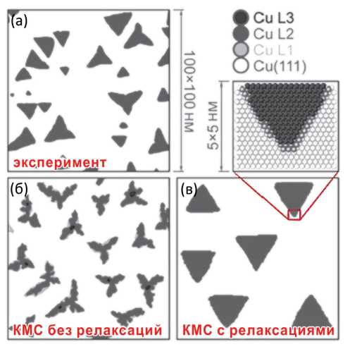 Рис. 4. Поверхность Cu(111) с осажденным в 0.4 монослоя кобальтом при 290 K: экспериментальная СТМ-карта (а) и результат KMC-моделирования без деформационных релаксаций (б) и с правильным их учетом (в). Рисунок адаптирован из [1].