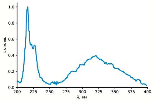 Спектр КЛ, зарегистрированный после окончания облучения электронами, приведен на рис. 4. Как можно видеть, в результате продолжительного облучения интенсивность полосы 320 нм существенно увеличилась и превысила интенсивность полосы 215 нм, более интенсивной в исходном образце. Дополнительных полос КЛ в исследуемом спектральном диапазоне после длительного воздействия электронным пучком не возникло.
