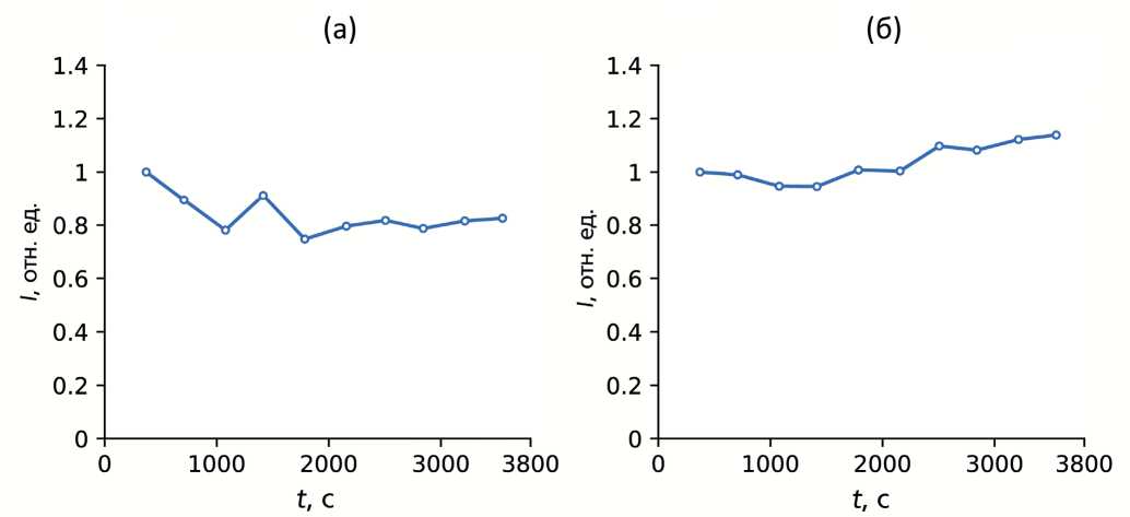 Рис. 2. Зависимости интегральных интенсивностей полос 215 (а) и 320 нм (б) от времени, полученные из последовательно измеренных спектров КЛ.