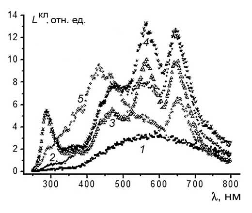 Рис. 4. Спектры КЛ (5 КэВ, 5 нА) структур: Si–TiO2 (1), Si–SiO2–TiO2 (2), Si–SiO2 (3), сумма спектров (4), Si–SiO2–TiO2 после электроформовки (mod) (5). Толщины: TiO2 – 28, SiO2 – 40 нм.