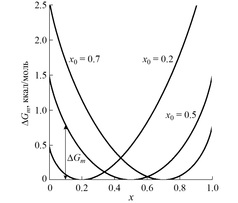 где x0 – концентрация одного из компонентов в кристалле, находящемся в равновесии с данной жидкой фазой, а x – его концентрация в кристалле, состав которого не соответствует равновесным условиям. При любом отклонении состава кристалла от равновесного значения изменение свободной энергии становится больше нуля, что приводит к растворению кристалла (рис. 3).