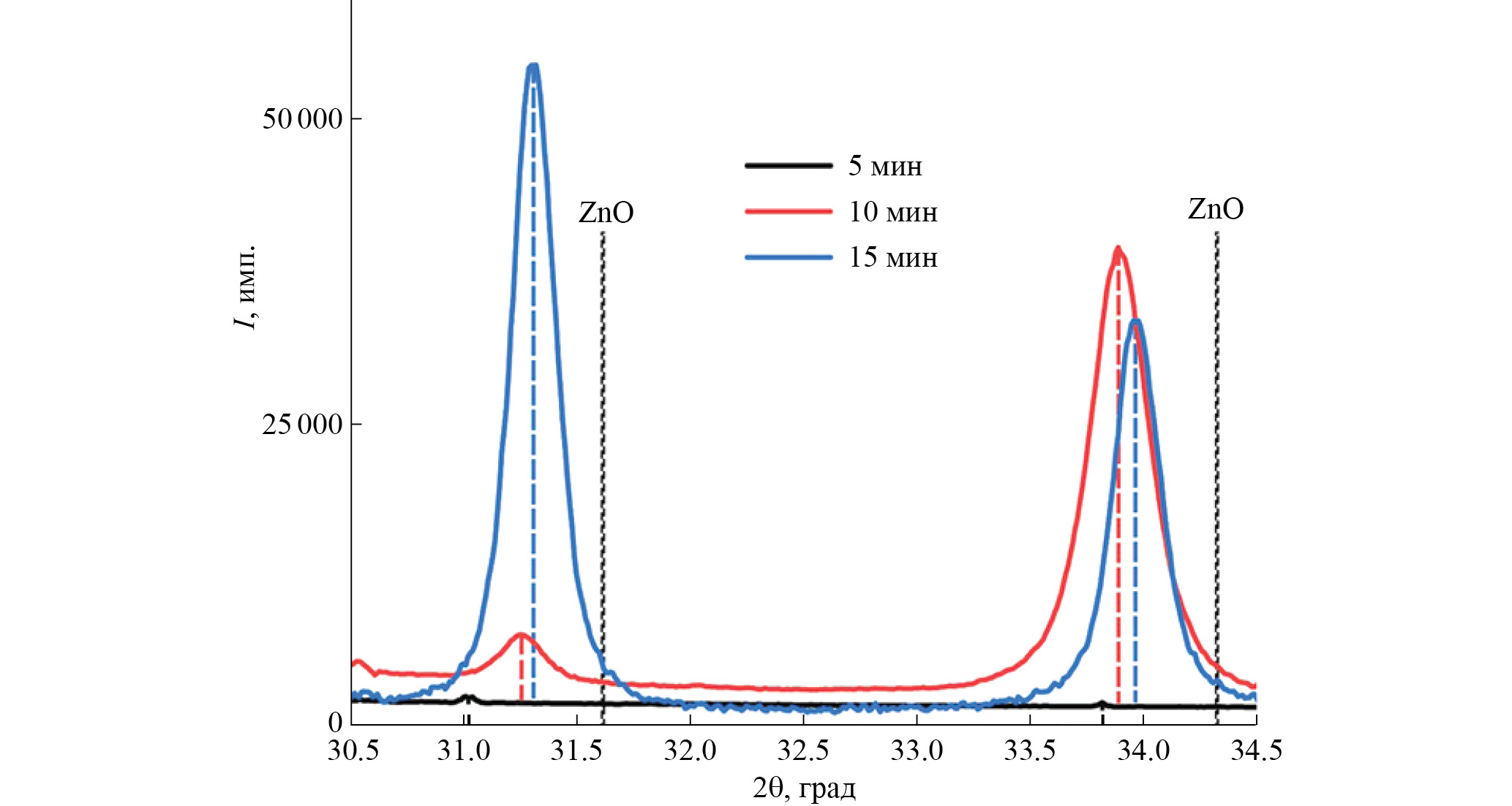 Исходя из данных, полученных при обработке дифрактограмм трех исследованных образцов, были рассчитаны параметры решетки полученных структур ZnO. Расчет параметров решетки проводили по трем пикам ZnO (100), (002) и (101) для образцов, время роста которых составляло 10 и 15 мин и по двум пикам ZnO (100) и (002) для образца, время роста которого составляло 5 мин. Погрешность расчета параметров решетки составляла ±0.0004 Å.