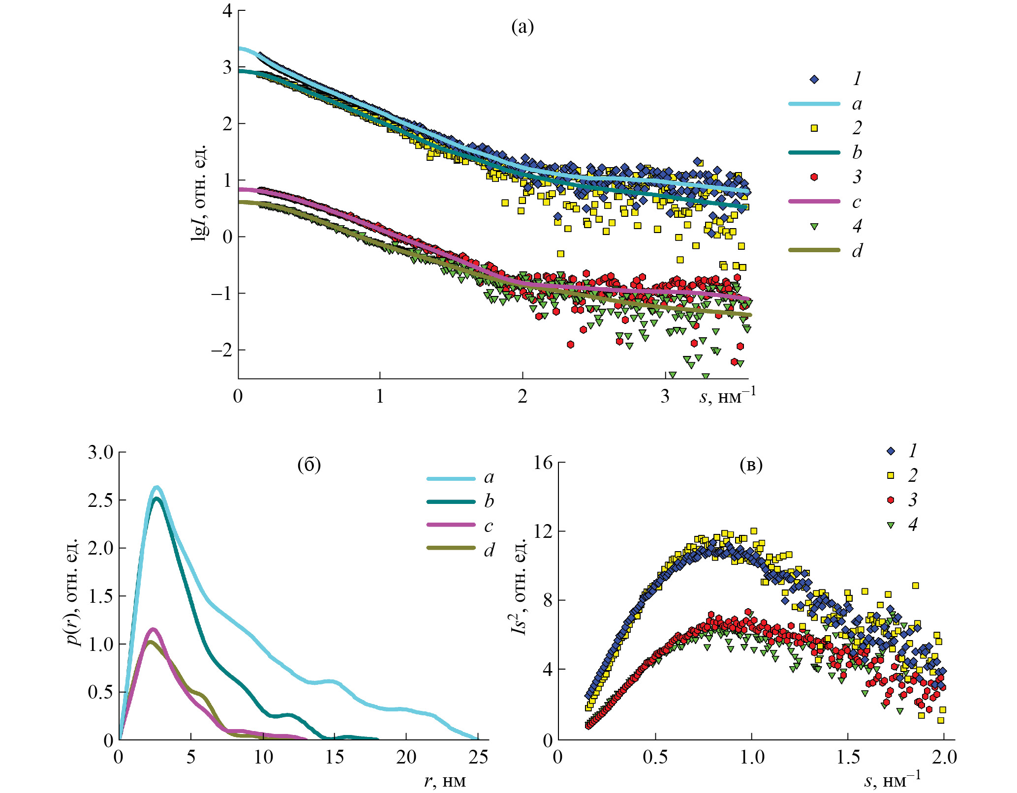 Рис. 1. Анализ кривых МУРР от белка IHF: а – экспериментальные кривые малоуглового рассеяния от IHF: 1 – концентрация 10 мг/мл в буфере I, 2 – концентрация 4.8 мг/мл в буфере I, 3 – концентрация 10 мг/мл в буфере II, 4 – концентрация 4.8 мг/мл в буфере II; a, b, c, d – соответствующие кривые, рассчитанные от функции распределения расстояниям (цветовая гамма соответствует парным функциям). Кривые разнесены попарно по вертикали для лучшей визуализации; б – функции распределения по расстояниям p(r): a, b, c, d соответствуют концентрациям 1, 2, 3, 4 соответственно на панели a; в – графики в координатах Кратки: 1, 2, 3, 4 соответствуют концентрациям панели а
