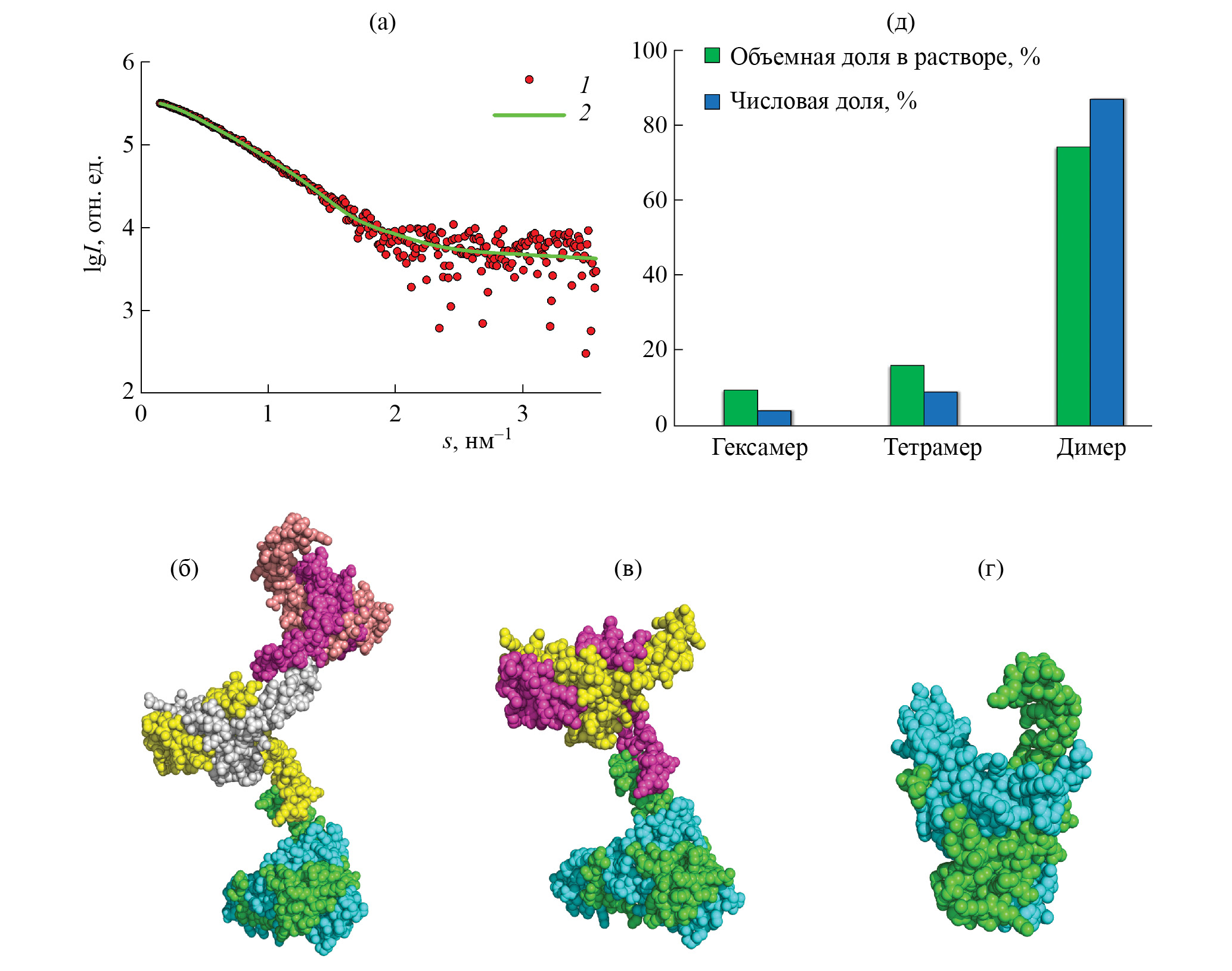 Рис. 3. Приближение экспериментальных данных МУРР равновесными смесями от IHF в буфере II: a – при концентрации 10 мг/мл, 1 – экспериментальные данные, 2 – расчетная кривая рассеяния, полученная в программе OLIGOMER от смеси димеров, тетрамеров и гексамеров, полученных в HEMIX (χ2 = 1.7); б – модель гексамера IHF, в – модель тетрамера IHF, г – модель димера IHF; д – гистограмма объемных и числовых долей олигомеров в равновесной смеси