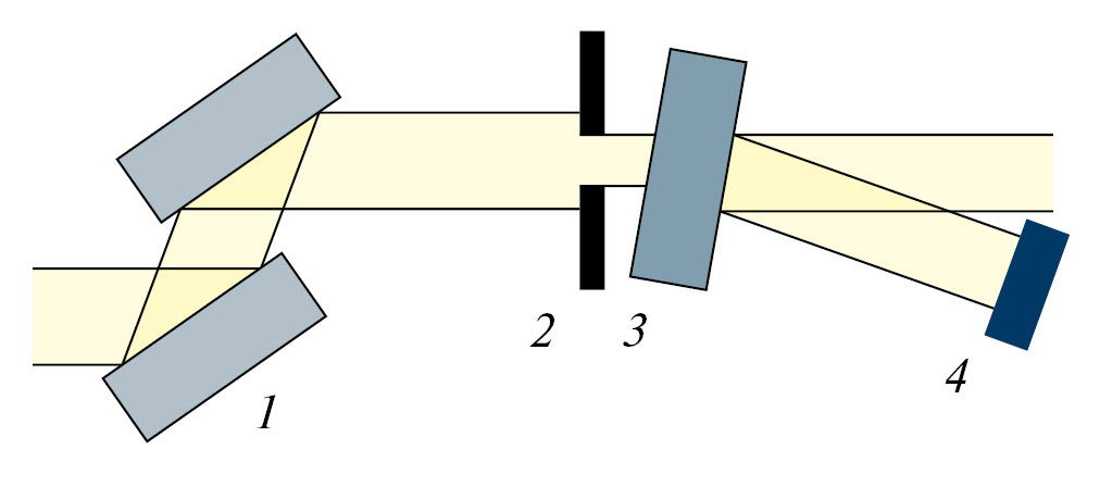 Рис. 1. Часть схемы эксперимента (без источника): 1 – монохроматор, 2 – щель, 3 – монокристалл, 4 – детектор.