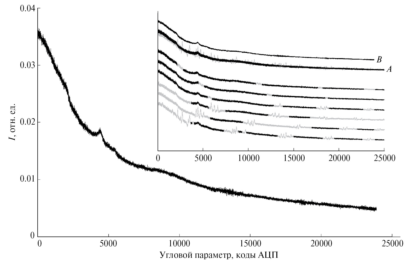 Для решения проблемы появления вспышек от разрядов из них отобрали шесть наиболее качественных (по визуальной оценке авторов) сканирований, дефектные участки были размечены вручную. Далее в процессе вычислений такие участки игнорировали, информацию на них замещали путем усреднения с результатами других измерений, при которых именно в этом месте помех не было (отбор сканирований проводили таким образом, чтобы это было возможно для любого значения углового параметра). На кривой, полученной таким образом, отсутствуют “зубцы”, связанные с микроразрядами на образце (как на рис. 3, кривая 2).