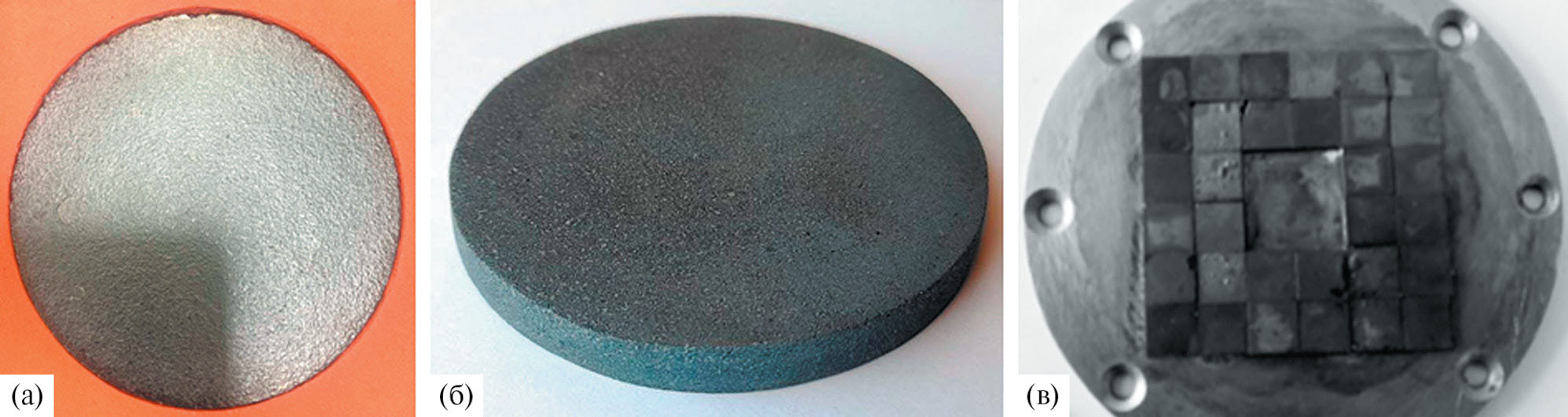 Источником распыляемого материала служили специально подготовленные мишени трех вариантов изготовления: мишень 1 готовили в форме диаметром 76 мм из спрессованной под давлением смеси порошков Mn и Si в стехиометрическом соотношении 1:2, в вакууме 10–1–10–2 Па путем последующего медленного нагревания под давлением до максимальной температуры 1100°С в течение 1 ч; мишень 2 готовили аналогично образцу 1, но из порошка дисилицида марганца (PubChem 6336881, массовая доля основного вещества не менее 96%); для мишени 3 использовали квадратные пластины толщиной 1 мм, вырезанные из монокристалла ВСМ, выращенного методом Бриджмена в лаборатории термоэлектрических материалов ФТИ им. А.Ф. Иоффе [19] (рис. 1). В качестве подложек использовали свежие сколы слюды KAl2 [AlSi3O10] (OH)2 (СТА ГОСТ 13750-78). Пленки осаждали на холодные подложки и затем подвергали нагреву до 800 К при давлении 10–1 Па.