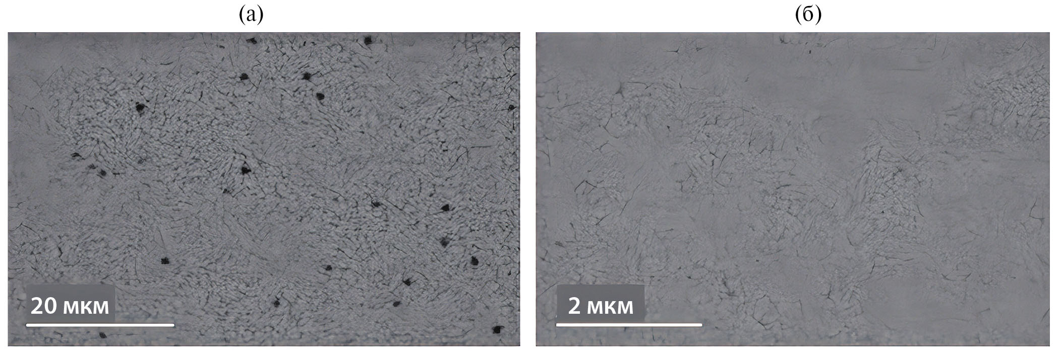 Рис. 3. РЭМ-изображение поверхности осажденной пленки (мишень 1) до (а) и после (б) нагрева.