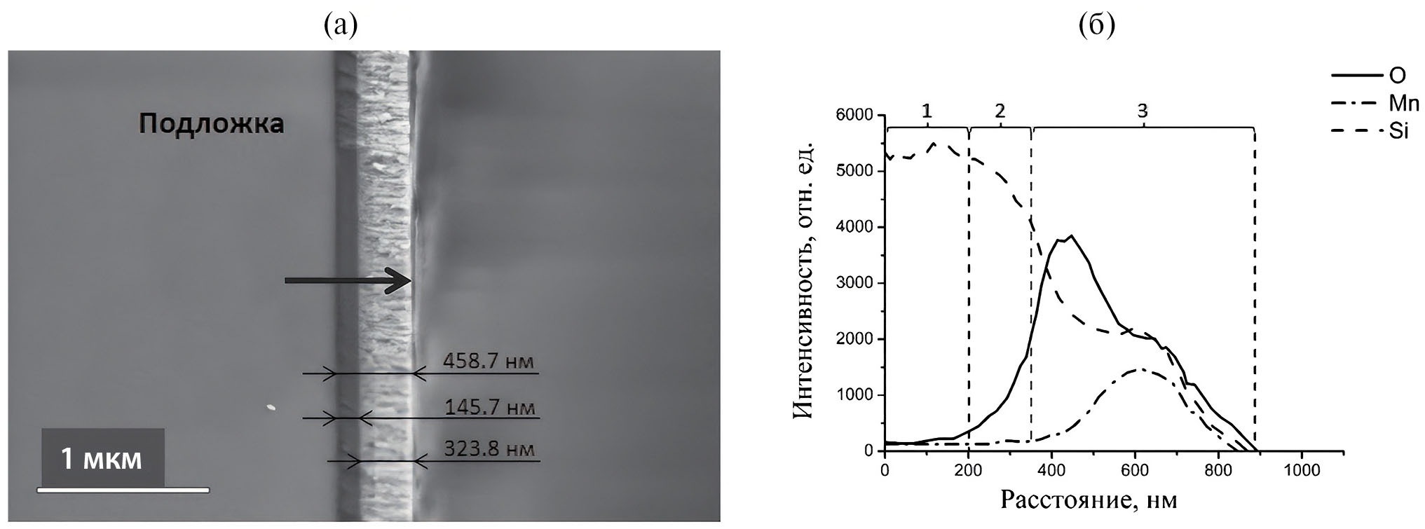 Рис. 4. РЭМ-изображение поперечного скола отожженной пленки (мишень 1) (а); профили распределения Mn, Si, O вдоль линии, перпендикулярной поверхности пленки: 1 – подложка, 2 – переходная область, 3 – пленка (б).