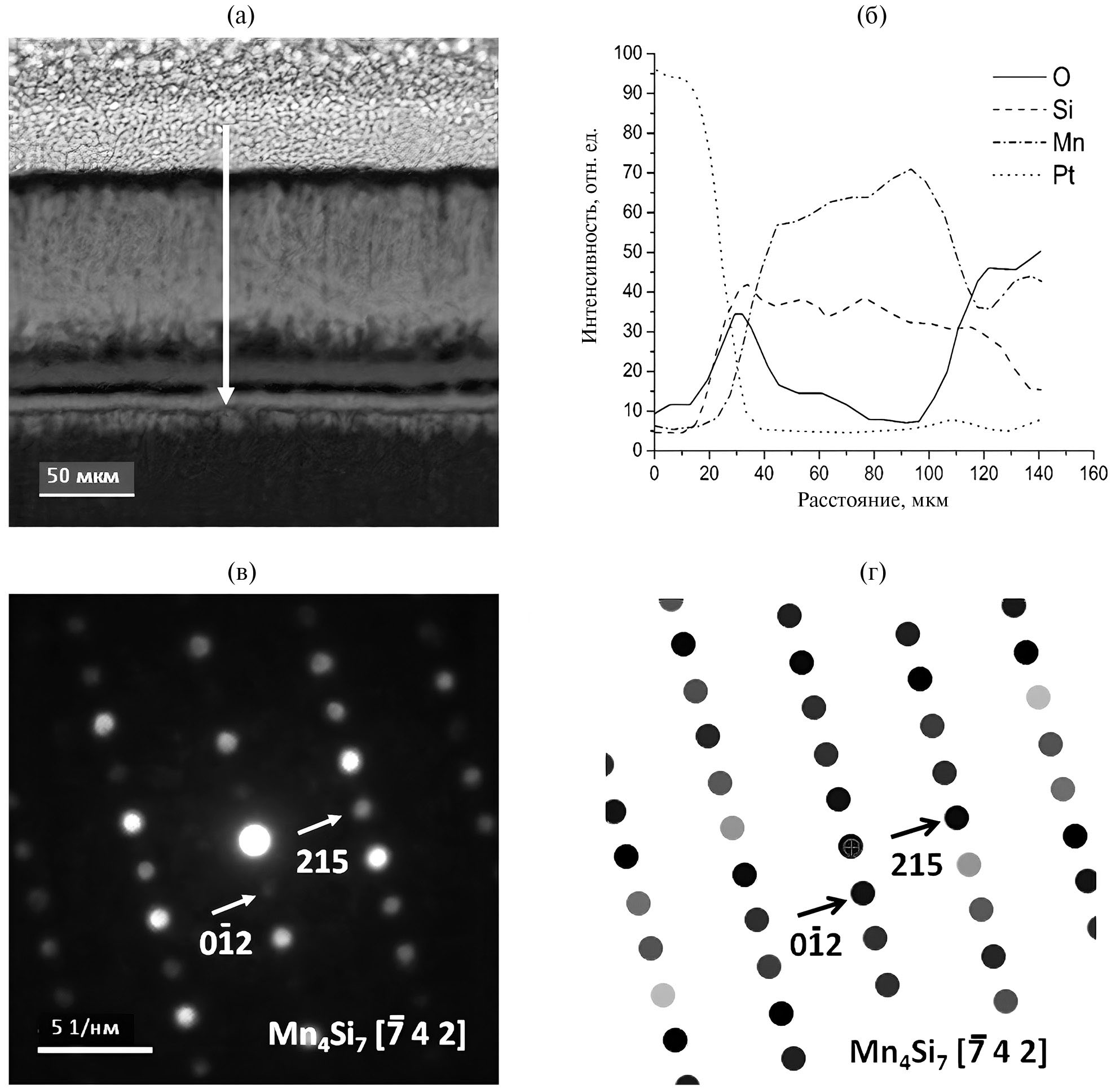 Рис. 6. ПЭМ-изображение тонкой ламели из отожженной пленки (мишень 2) (а). Профили распределения элементов вдоль стрелки на рис. 6а (платина напылена на поверхность пленки для укрепления образца при утончении) (б). Экспериментальная (в) и расчетная (г) дифракционные картины на просвет, подтверждающие формирование в пленке кристаллической фазы Mn4Si7.