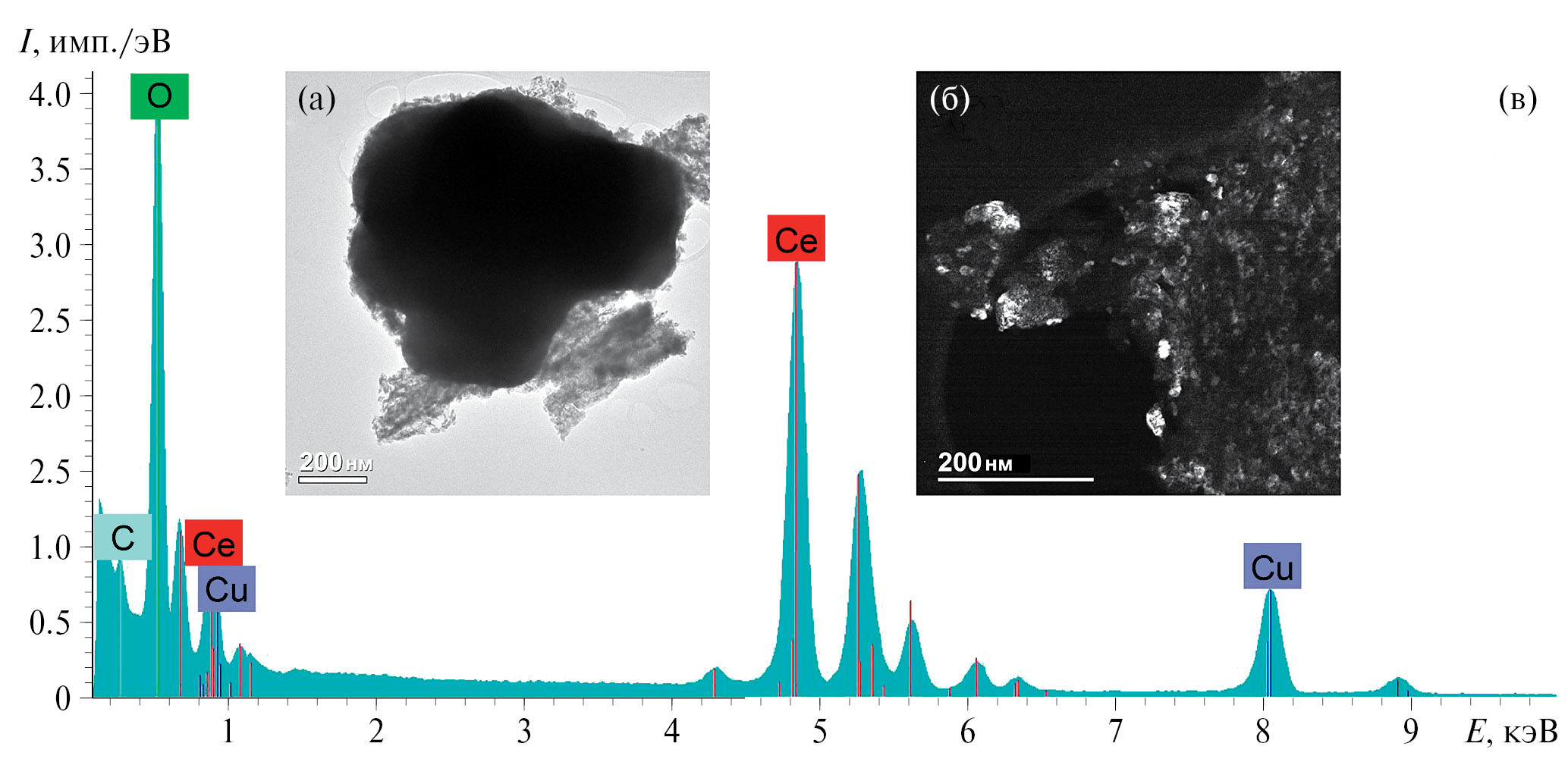 Влияние механической обработки на морфологию исходного CeO2 и особенности морфологии композитов Cu–CeO2 были детально изучены с помощью ПЭМ и ПРЭМ с использованием электронной дифракции и карт распределения химических элементов.