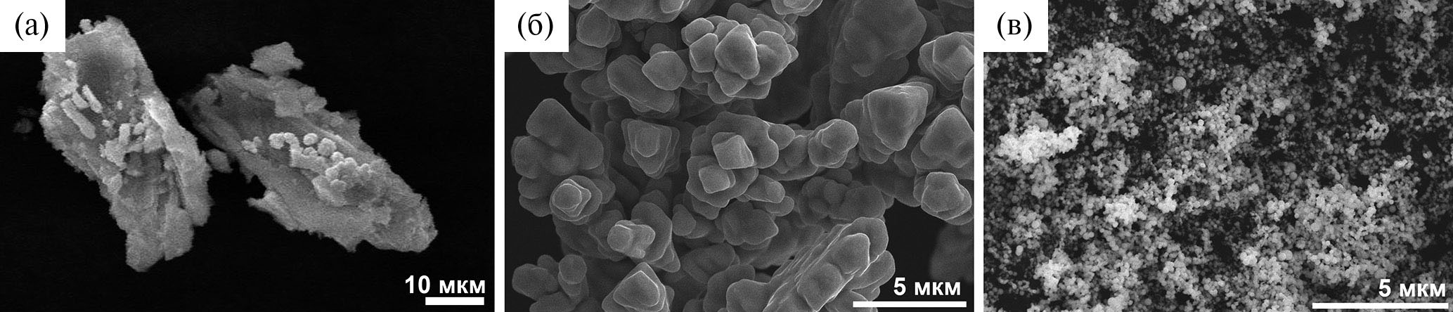 Рис. 2. РЭМ-изображения исходных порошков: CeO2 (а), дендритной меди Cu(М), полученный электрохимическим методом (б), меди Cu(N), полученный левитационно-струйным методом (в).