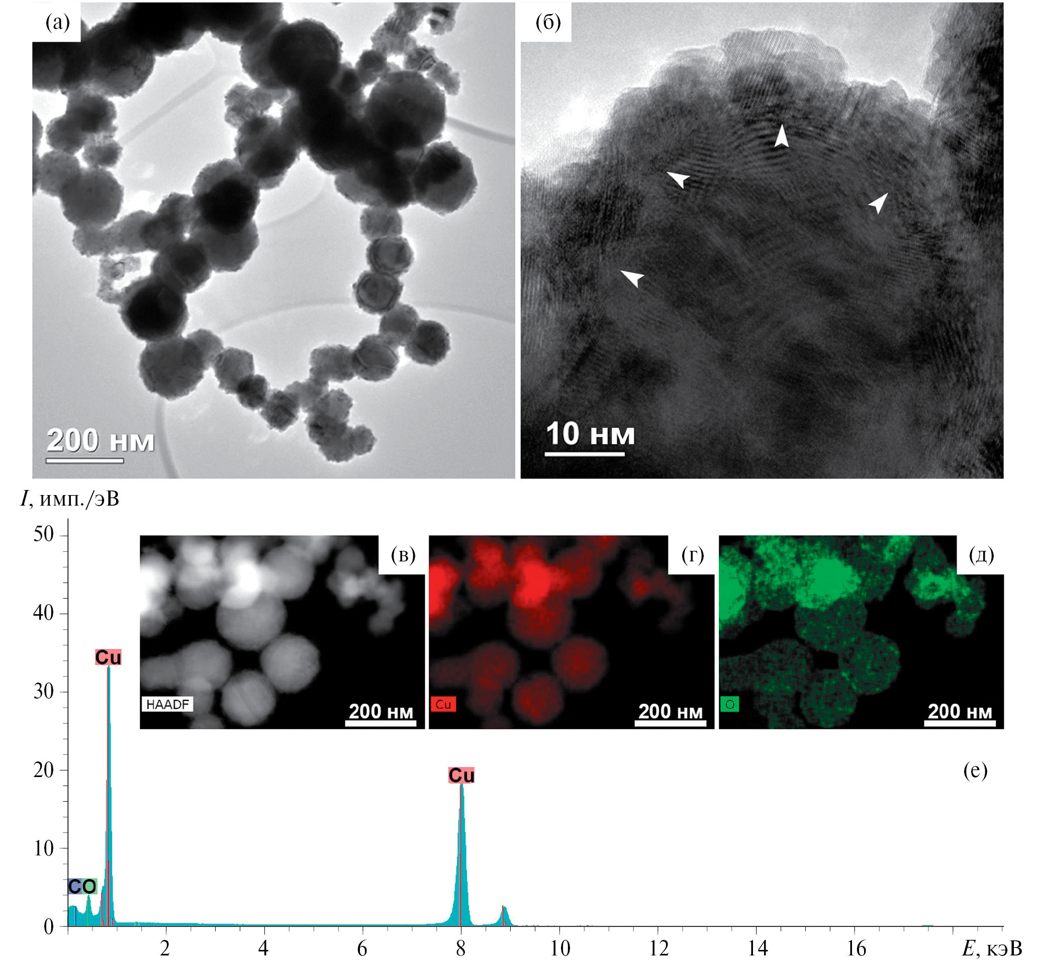 Рис. 3. Микротруктура частиц порошка Cu(N): цепочки частиц (а), ВРЭМ-изображение ядра и оболочки отдельной частицы (б), ПРЭМ-изображение и карты распределения меди и кислорода для отдельных частиц (в–д), энергодисперсионный спектр (е).