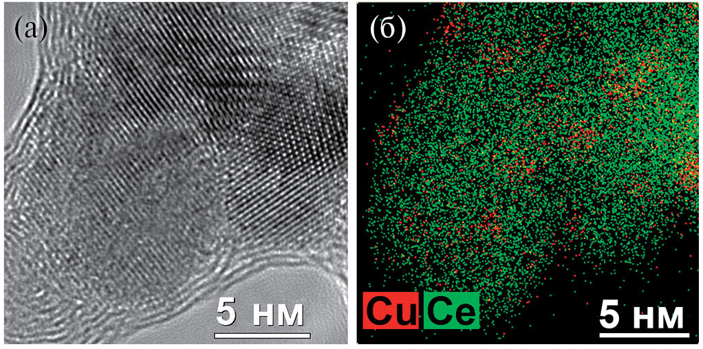 Рис. 7. Структура композита Cu(M)–CeO2 при облучении электронным пучком в течение 10 мин: ВРЭМ-изображение (а), ЭДС-картирование (красный цвет – медь, зеленый – церий) (б).