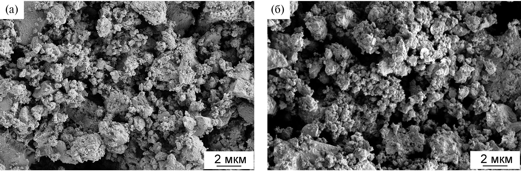 Рис. 3. СЭМ-изображения частиц Pr0.97Sr0.03F2.97 после МД в течение τ = 1 (а) и 4 ч (б).