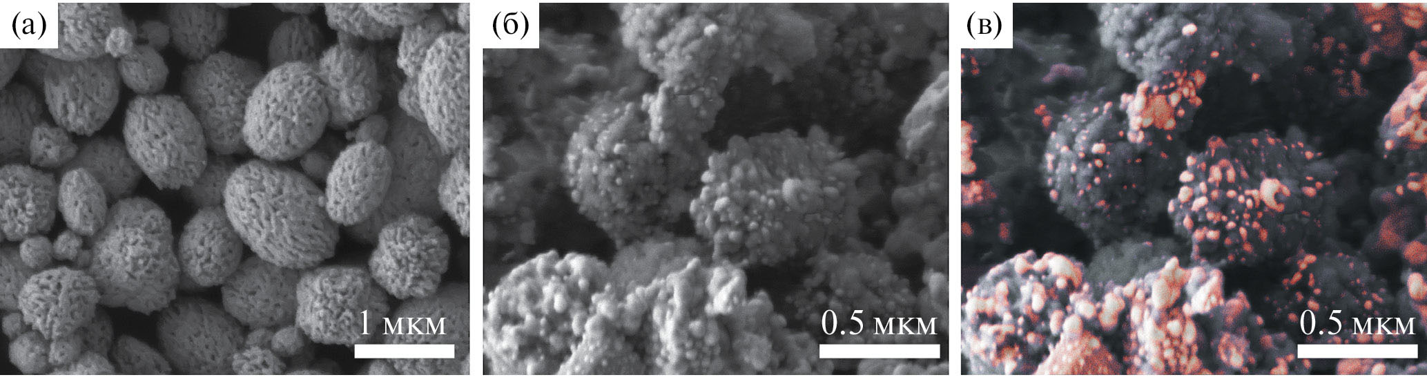Рис. 3. СЭМ-изображения частиц CaCO3, синтезированных в объемной фазе с использованием этиленгликоля (а), и гибридных частиц CaCO3@Ag, синтезированных капельным методом с использованием микрофлюидного устройства, в стандартном режиме (б) и в сочетании с режимом рассеяния обратных электронов (в).