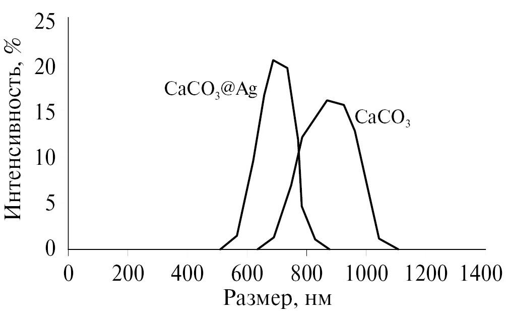 Рис. 4. Результаты ДРС по распределению частиц CaCO3, синтезированных в объемной фазе с использованием этиленгликоля, и гибридных частиц CaCO3@Ag, синтезированных капельным методом с использованием микрофлюидного устройства.